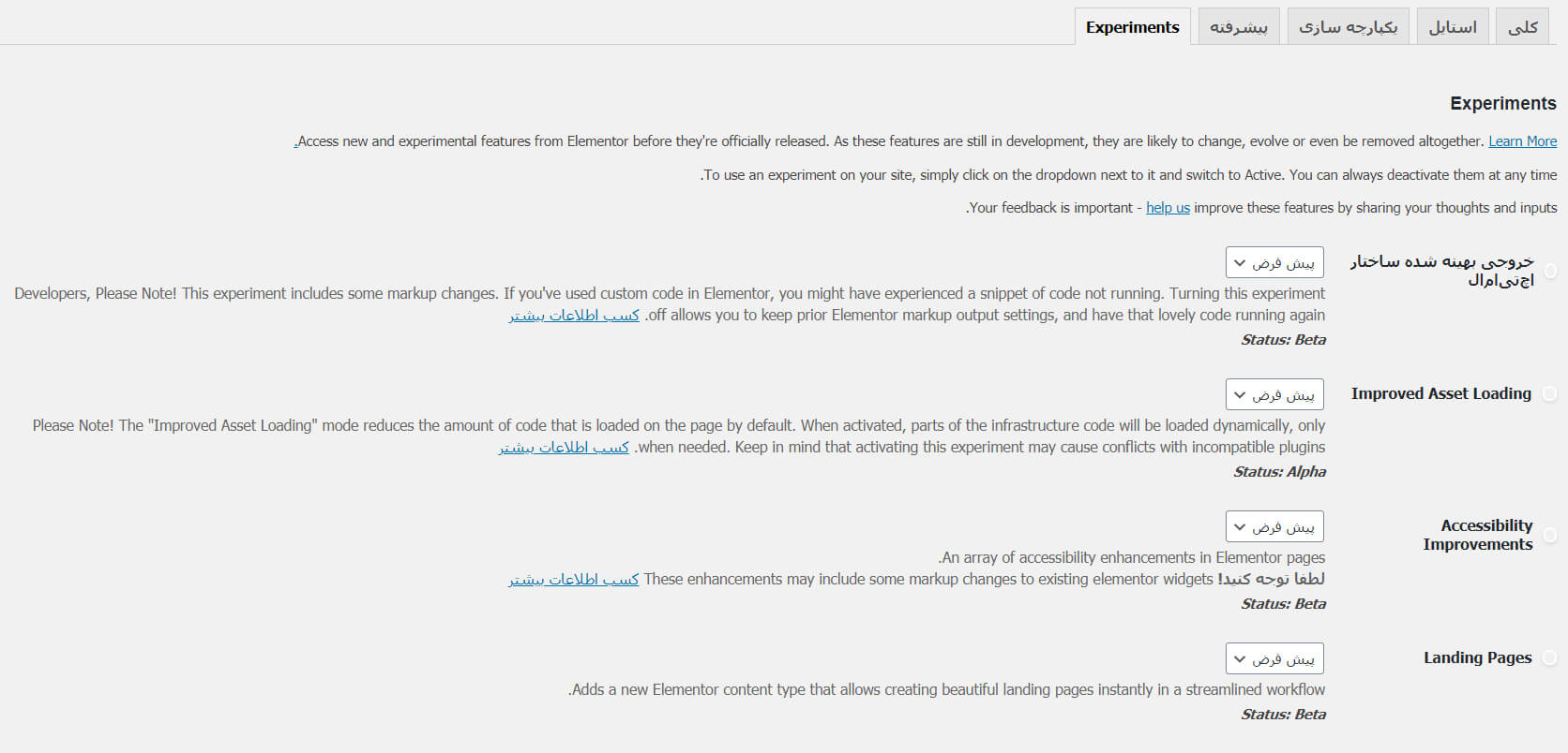 در این نسخه قابلیت Elementor Experiments در منوی تنظیمات المنتور اضافه شده است