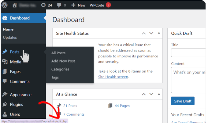 جهت یافتن URL آیتم منو فقط کافیست اشاره گر ماوس را روی لینک قرار دهید و به status bar یا نوار وضعیت مرورگر نگاه کنید. مثلا در تصویر زیر آدرس URL صفحه نوشته های وردپرس را در نوار وضعیت مشاهده می کنید.
