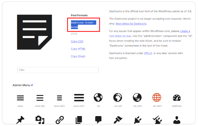 قدم بعدی ورود به سایت Dashicons و انتخاب آیکن به دلخواه است. هر نمادی که انتخاب شماست روی آن کلیک کنید و slug یا همان نام آیکون را کپی کنید چون در مرحله بعد به آن احتیاج دارد.