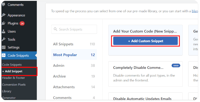 حالا به یک پلاگین احتیاج دارید که قطعه کد خود را به سایت اضافه کنید. افزونه WP code برای این منظور مناسب است و می توانید نسخه رایگان آن را از مخزن وردپرس دانلود و نصب کنید. حالا به سادگی با قرار دادن ماوس در باکس Add Your Custom Code دکمه برای افزودن تکه کد سفارشی فعال می شود.