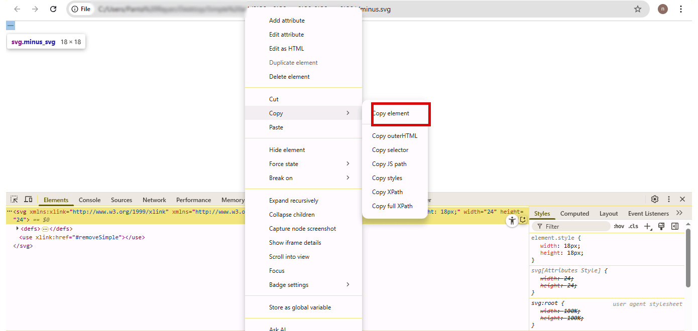 در اینجا ما از فایل های svg استفاده کردیم. برای کپی کردن کد فایل های svg کافیست آن را در مرورگر کروم باز کنید و در بخش inspector مطابق تصویر زیر روی تگ svg کلیک راست کرده و گزینه copy element را بزنید. و بعد کد را بین تگ <div> باز و بسته در تصویر بالا قرار دهید.